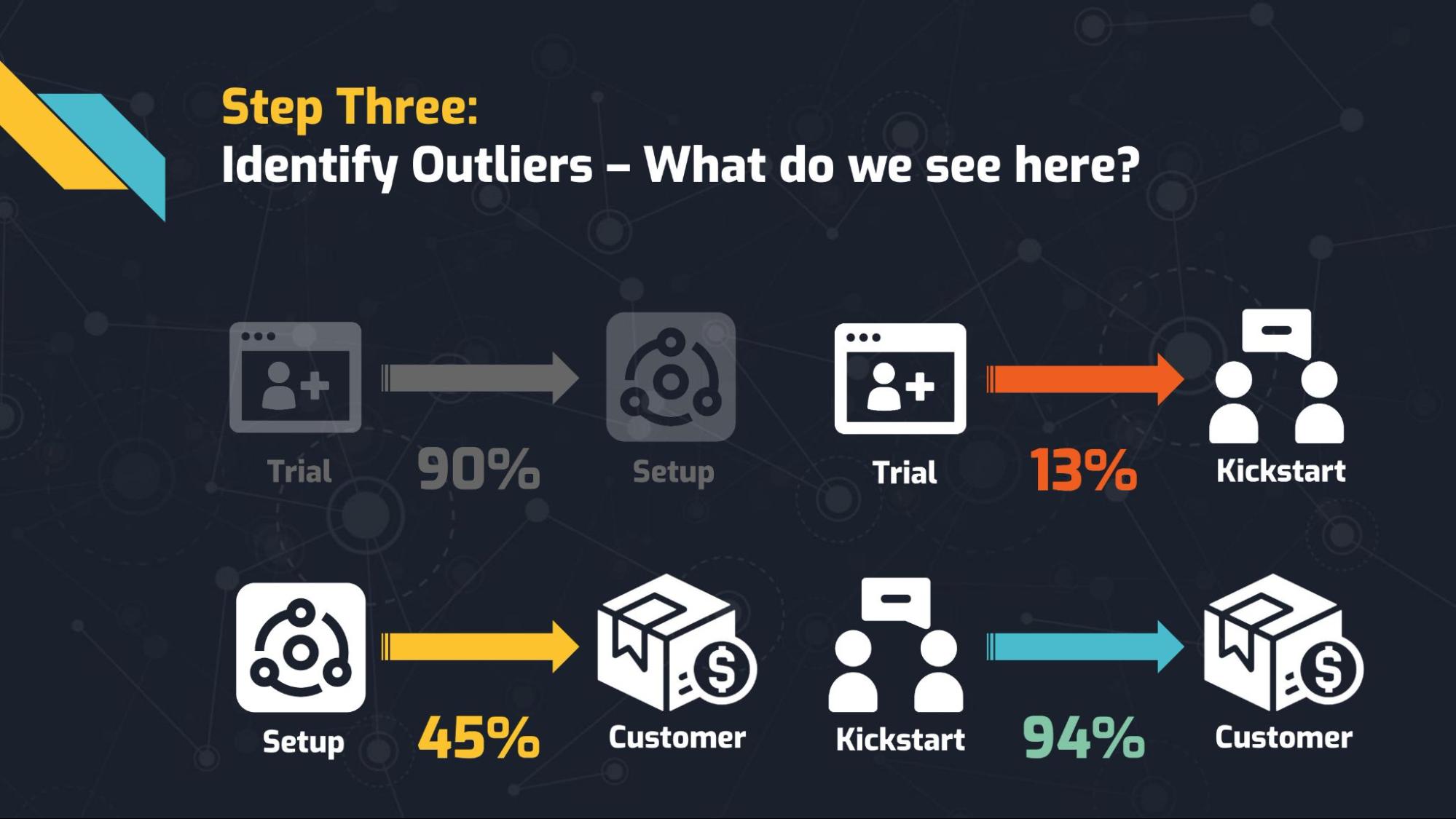 Now you’ve identified the unique segment that’s having trouble with the kickstart calls, and you can start thinking of solutions to help them move forward. It can be offering them a $25 gift certificate, a better self-serve option, or have an entirely different flow for this segment.