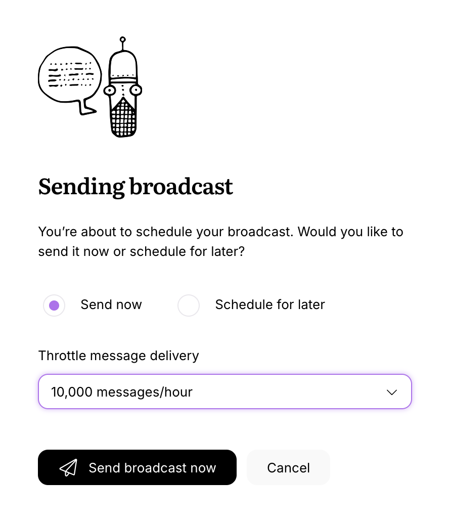 You can send your broadcast in smaller batches instead of all at once, which is helpful with bigger lists. Throttling settings are available as you send or schedule your broadcast: